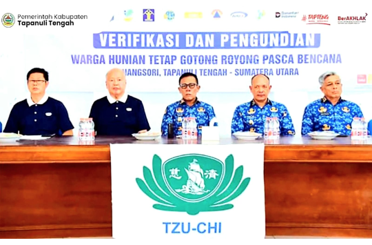 Pemerintah Kabupaten (Pemkab) Tapanuli Tengah (Tapteng) menggelar verifikasi sekaligus pengundian 118 unit Hunian Tetap (Huntap) tahap pertama di Pinangsori, Senin (27/4/2026). Kegiatan berlangsung di Aula Dinas Pendidikan Tapteng dengan melibatkan Yayasan Buddha Tzu Chi Indonesia.