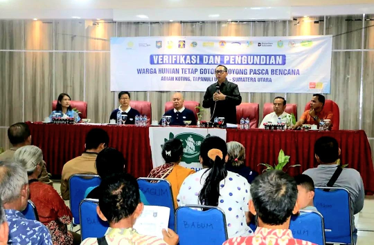 Bupati Tapanuli Utara, Jonius Taripar Parsaoran Hutabarat, memimpin langsung proses verifikasi dan pengundian penerima hunian tetap gotong royong bagi korban bencana hidrometeorologi di Adiankoting.