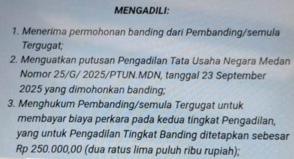 “Putusan banding ini menegaskan bahwa pertimbangan hukum PTUN Medan telah tepat dan sesuai dengan asas-asas umum pemerintahan yang baik (AUPB). Negara dan pejabat administrasi tidak boleh bertindak sewenang-wenang di luar koridor hukum,” ujar Hermanto, Selasa (13/1/2026).
