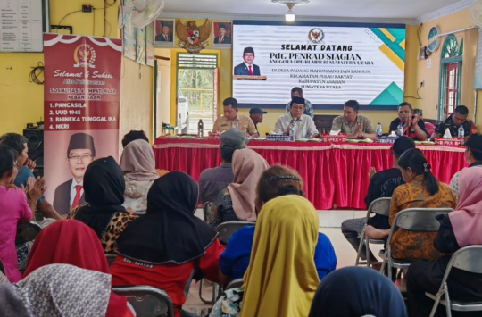 Asahan – Anggota DPD RI/MPR RI perwakilan Sumatra Utara, Pdt. Penrad Siagian, menggelar kegiatan Sosialisasi Empat Pilar MPR RI (SOS MPR) Tahap XII di Aula Desa Padang Mahondang, Kecamatan Pulau Rakyat, Kabupaten Asahan, Sabtu, 14 Desember 2025. Kegiatan berlangsung sejak pukul 08.00 hingga 13.30 WIB dan diikuti warga Desa Padang Mahondang, khususnya kelompok tani.
