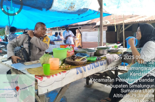 Simalungun, Kabarnas.id - Bhabinkamtibmas dari Polsek Perdagangan, Aiptu Sagimun, melakukan sambang dan patroli dialogis di pasar tradisional Pematang Bandar, Kelurahan Pematang Bandar, Kecamatan Pematang Bandar, Kabupaten Simalungun, Sabtu 1 November 2025. Dalam kesempatan tersebut, ia berdialog dengan para pedagang dan pembeli, serta mengimbau masyarakat agar senantiasa menjaga barang berharga mereka.