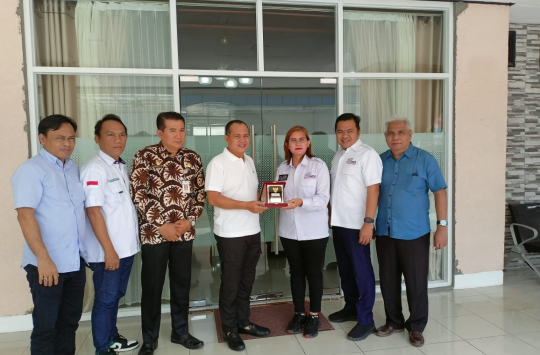 Diakhir pertemuan, Bupati Batubara juga menyerahkan plakat kepada Ketua SMSI Sumut, Erris J Napitupulu sebagai cenderamata. ()