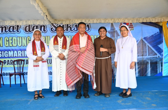 Sebagai tanda kasih dan penghormatan, RP Yanuarius Berek SVD bersama Pastor Sebastian Siringoringo menyerahkan cenderamata berupa ulos kepada Bupati Oloan Paniaran Nababan mewakili seluruh umat Katolik Parlilitan.