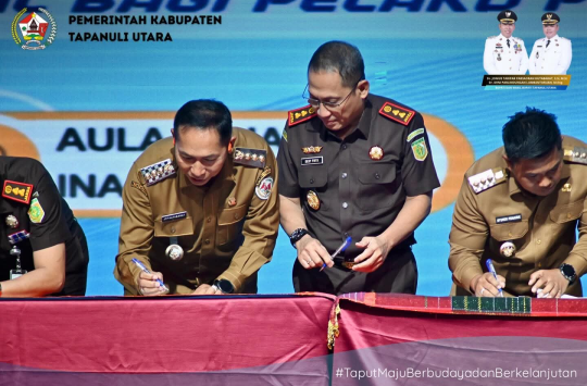 barnas.id - Medan, KaBupati Tapanuli Utara (Taput), Dr. Jonius Taripar Parsaoran Hutabarat, S.Si., M.Si, bersama Kepala Kejaksaan Negeri Tapanuli Utara, Dedy Frits Rajagukguk, S.H., M.H, menghadiri penandatanganan Memorandum of Understanding (MoU) antara Kejaksaan Tinggi Sumatera Utara dengan Pemerintah Provinsi Sumatera Utara, serta antara Kejaksaan Negeri se-Sumatera Utara dengan Pemerintah Kabupaten/Kota se-Sumatera Utara.