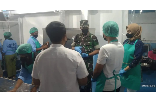Kapten Tampubolon mengevaluasi seluruh area dapur, mulai dari ruang pemorsian, pengolahan, peracikan, hingga penyimpanan bahan makanan seperti beras. Tak luput pula ruang pencucian, peralatan masak, kamar mandi karyawan, serta ruang tunggu dan pengemasan turut diperiksa.