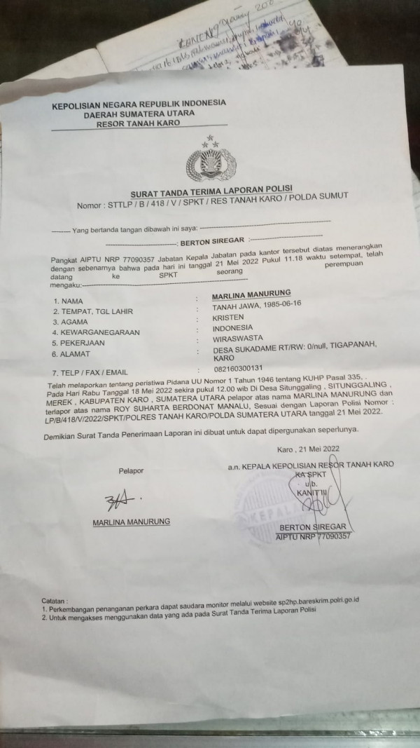 Marlina ke Polres Tanah Karo karena dalam STPL tersebut pasal yang diterapkan hanya Pasal 335 Undang-undang Nomor 1 Tahun 1946. Ia mempertanyakan soal tindakan hukum yang berkaitan dengan kepemilikan senjata api dan kekerasan rumah tangga.