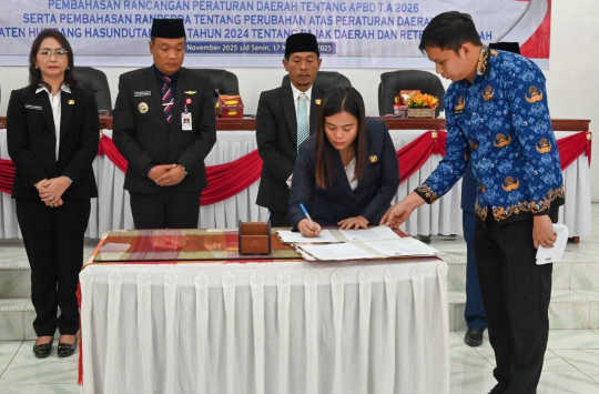 Doloksanggul, Kabarnas.id – Bupati Humbang Hasundutan (Humbahas), Dr. Oloan Paniaran Nababan, SH, MH bersama Dewan Perwakilan Rakyat Daerah (DPRD) resmi menyetujui Rancangan Peraturan Daerah (Ranperda) APBD Tahun Anggaran 2026 senilai Rp. 888.618.919.671. Selain itu, Ranperda Perubahan atas Perda Nomor 1 Tahun 2024 tentang Pajak Daerah dan Retribusi Daerah (PDRD) juga disahkan menjadi Perda dalam Rapat Paripurna DPRD di Ruang Paripurna, Senin (17/11/2025).