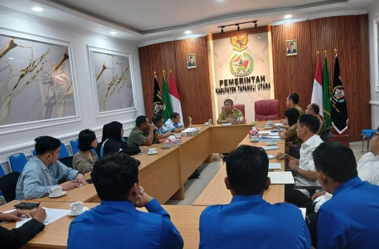Wakil Bupati Tapanuli Utara, Dr. Deni Lumbantoruan, M.Eng, didampingi Kepala Dinas Ketenagakerjaan Josua JE Hutabarat, melaksanakan pembahasan percepatan Program Kredit Usaha Rakyat (KUR) bagi pekerja migran bersama empat Lembaga Pelatihan Kerja (LPK) Swasta, Perseroda, dan Petani Milenial di Ruang Rapat Mini Kantor Bupati Taput, Tarutung, Senin (3/11/2025).