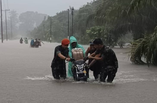 Tapteng - Prajurit Batalyon Komando 469 Korps Pasukan Gerak Cepat (Korpasgat) bergerak cepat mengevakuasi warga terdampak banjir di Desa Kolang, Kabupaten Tapanuli Tengah (Tapteng), Sumatera Utara, Selasa (25/11/2025). Banjir melanda setelah hujan lebat mengguyur wilayah, menyebabkan Sungai Aek Kolang meluap dan merendam permukiman warga.