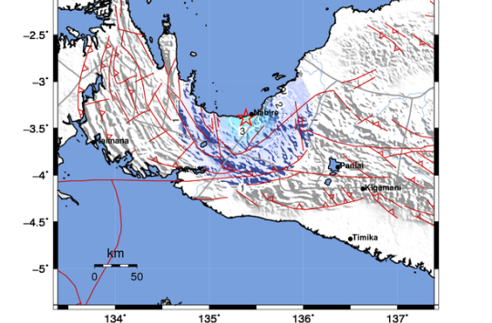 Mengutip laman BMKG dalam rilisnya jam 17:57:44 WIB, lokasi pusat (Episenter) gempa terletak pada titik koordinat, 3,39 Lintang Selatan (LS), 135,39 Bujur Timur (BT) , atau tepatnya berlokasi 13 KM di Darat, Barat Daya Nabire di kedalaman (Hiposenter) 33 KM di bawah permukaan laut.