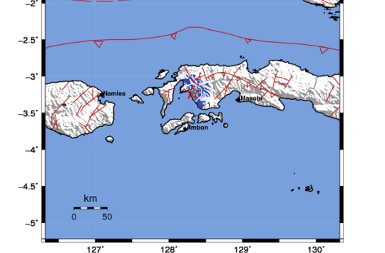 Mengutip laman BMKG dalam rilisnya jam 22:25:02 WIB, lokasi pusat (Episenter) gempa terletak pada titik koordinat, 3,22 Lintang Selatan (LS) 128, 32 Bujur Timur (BT) , atau tepatnya berlokasi 4 KM di Darat, Timur Kairatu, Seram Bagian Barat di kedalaman (Hiposenter) 10 KM.