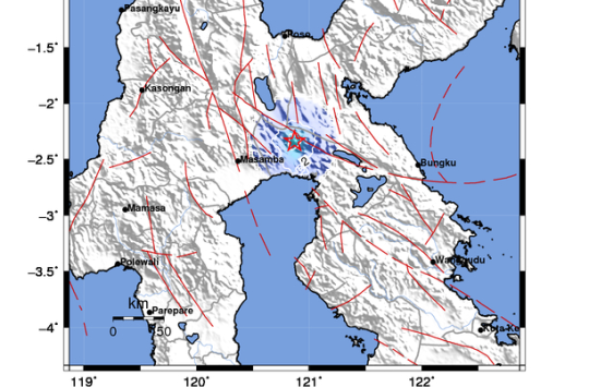 Dalam rilis BMKG pada jam 14:32:37 WIB, lokasi pusat gempa terletak pada titik koordinat, 2,34 Lintang Selatan (LS) – 120,87 Bujur Timur (BT) , atau tepatnya berlokasi di darat 42 KM barat laut Luwu Timur, di kedalaman 5 KM.
