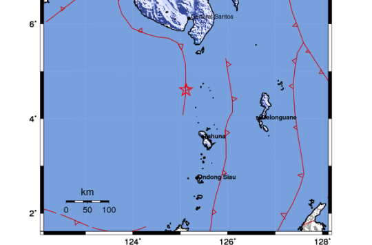 Mengutip laman BMKG dalam rilisnya jam 02:30:56 WIB, lokasi pusat (Episenter) gempa terletak pada titik koordinat, 4,61 Lintang Utara (LU),125,12 Bujur Timur (BT) , atau tepatnya berlokasi 118 KM di Laut, Barat Laut Tahuna, Kep. Sangihe di kedalaman (Hiposenter) 10 KM di bawah permukaan laut.