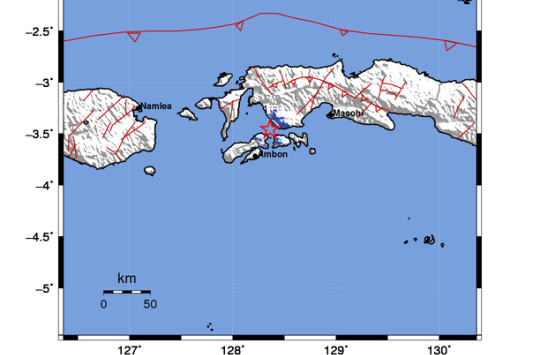 Mengutip laman BMKG lokasi pusat (Episenter) gempa terletak pada titik koordinat 3,46 Lintang Selatan (LS),128,36 Bujur Timur (BT) , atau tepatnya berlokasi di Laut 13 KM , Selatan Kairatu, pada kedalaman (Hiposenter) 10 KM di bawah permukaan laut.