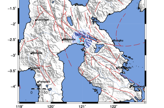 Dalam rilis BMKG pada jam 12:24:09 WIB, lokasi pusat gempa terletak pada titik koordinat, 2,50 Lintang Selatan (LS) – 120,99 Bujur Timur (BT) , atau tepatnya berlokasi di darat 22 KM barat laut Luwu Timur, di kedalaman 2 KM.