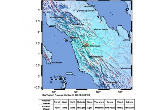 Paluta - Gempa bumi dengan kekuatan Magnitudo 5,3 mengguncang Kabupaten Padang Lawas Utara (Paluta), Rabu (11/8/2021) sekitar pukul 12.20 WIB.