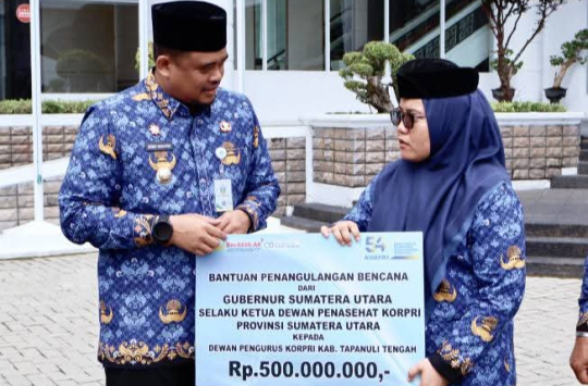 MEDAN – Gubernur Sumatera Utara Muhammad Bobby Afif Nasution selaku Ketua Dewan Penasihat KORPRI Sumut menyerahkan bantuan kemanusiaan bagi daerah terdampak bencana alam, termasuk Kabupaten Tapanuli Tengah (Tapteng) sebesar Rp.500 juta. Penyerahan bantuan berlangsung di Kantor Gubernur Sumatera Utara, Jalan Diponegoro, Medan, Rabu (17/12/2025).