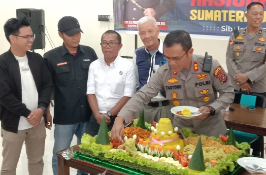 Usai mengucapkan sambutan, Kapolres Sibolga di daulat memotong tumpeng, sekaligus membagikan ke sejumlah awak media. (Jobbinson Purba).