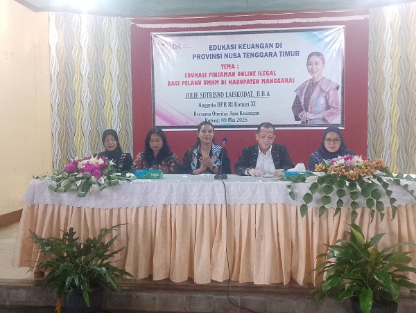 Manggarai. Anggota DPR RI Komisi XI, Julie Soetrisno Laiskodat, bekerja sama dengan Otoritas Jasa Keuangan (OJK) menggelar kegiatan edukasi tentang bahaya pinjaman online (pinjol) ilegal bagi pelaku UMKM di Kabupaten Manggarai, Provinsi Nusa Tenggara Timur, bertempat di Aula Efata Ruteng, Jumat 9 Mei 2025.