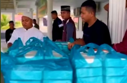 Dengan penuh keikhlasan, personel Brimob membagikan paket makanan sebagai bentuk empati dan kepedulian terhadap sesama.
