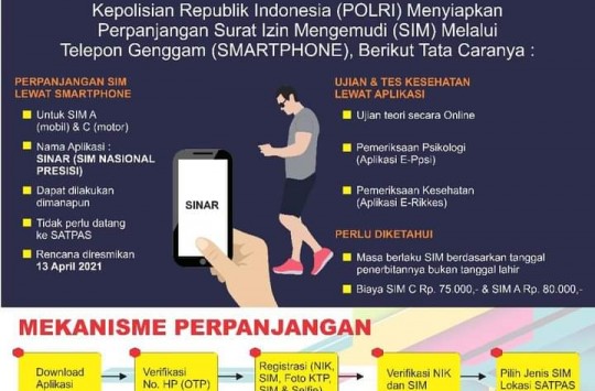 Untuk memperoleh layanan pembuatan SIM C dan A melalui smartphone itu, langkah awal adalah mengunduh aplikasi Sinar (SIM Nasional Presisi) dan bisa digunakan mulai 12 April 2021.