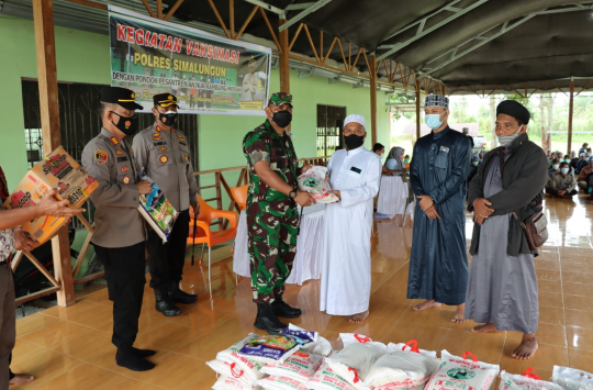 Diakhir kegiatan Kapolres Simalungun bersama Dandim 0207/Simalungun membagikan paket sembako kepada santri yang sudah divaksin.