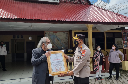 Simalungun - Ketua Umum Komisi Nasional Perlindungan Anak, Arist Merdeka Sirait memberikan penghargaan kepada Kapolres Simalungun AKBP Nicolas Dedy Arifianto, mendapat penghargaan di Mapolsek Parapat Polres Simalungun Tigaraja, Girsang Sipangan Bolon, Kabupaten Simalungun Jumat (5/11/2021).