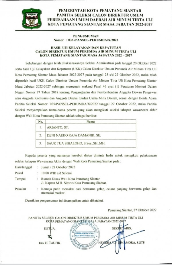 Pematangsiantar - Setelah melalui proses pendaftaran, seleksi administrasi, Uji Kelayakan dan Kepatuhan (UKK), Pemerintah Kota Pematangsiantar mengumumkan tiga nama Calon Direktur Umum Perusahaan Umum Daerah (Perumda) Air Minum Tirtauli.