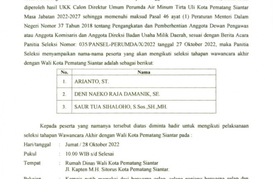 Guna mengikuti tahap selanjutnya, ketiganya diminta hadir mengikuti tahap wawancara akhir dengan Wali Kota Pematangsiantar, Jumat 28 Oktober 2022 di Rumah Dinas Wali Kota, Jalan Kapten M.H Sitorus.