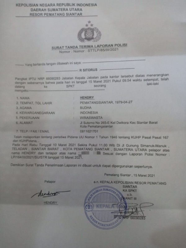 Sejak 2017 hingga awal 2021, LD tidak pernah meninggalkan lahan pemilik. Padahal, segala upaya kekeluargaan telah dilakukan tapi tidak membuahkan hasil. Merasa tak ada jalan lagi, 15 Maret 2021, Hendry selaku putra pemilik bersama kuasa hukumnya melaporkan perbuatan LD ke Polres Pematangsiantar dan laporan diterima.