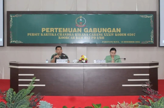 Simalungun – Persit Kartika Chandra Kirana (KCK) Cabang XXXIV Dim 0207/Simalungun, Korem 022/Pantai Timur, PD I/Bukit Barisan, menggelar Pertemuan Gabungan yang berlangsung hangat dan penuh kekeluargaan di Balai Pamungkas Makodim 0207/Simalungun, Jalan Jon Horailam Saragih, Pamatang Raya, Kecamatan Raya, Kabupaten Simalungun, Kamis (18/12/2025).