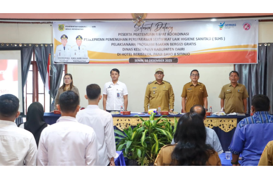 Dairi– Wakil Bupati Dairi, Wahyu Daniel Sagala, memimpin rapat koordinasi percepatan pemenuhan persyaratan Sertifikat Laik Higiene Sanitasi (SLHS) dalam pelaksanaan Program Makan Bergizi Gratis (MBG), Senin (15/12/2025). Kegiatan berlangsung di Hotel Beristera, Sitinjo, dan turut dihadiri Staf Ahli Bidang Kemasyarakatan, SDM dan Pelayanan Umum, Ruspal Simarmata.