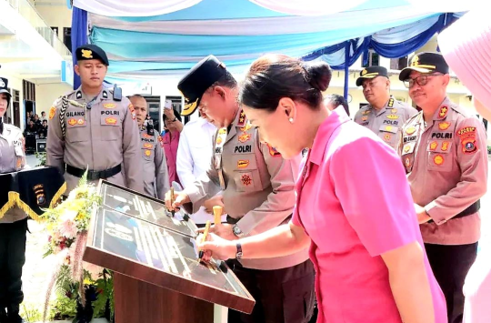 Turut hadir Ketua Pengurus Daerah Bhayangkari, Ny. Mona Whisnu Hermawan, yang mendampingi proses penandatanganan prasasti sebagai simbol pengesahan perubahan nomenklatur.