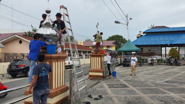 Bakti sosial yang digelar sejak pagi hari adalah membersihkan seputaran Mesjid Raya, kebersihan menara, penanaman bunga, memperbaiki sound system maupun bersihkan kubah itu langsung dihadiri Ketua BKM Mesjid Raya Kota Pematangsiantar, H Irmadi Lubis.