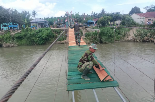 DELI SERDANG — Satuan Tugas Penanggulangan Bencana Alam (Satgas Gulbencal) Kodam I/Bukit Barisan terus mempercepat renovasi Jembatan Gantung Garuda yang berada di Desa Bandar Kuala, Kecamatan Galang, Kabupaten Deli Serdang, Sumatera Utara, pada Selasa (30/12/2025). Perbaikan ini dilakukan sebagai bagian dari upaya pemulihan infrastruktur pascabencana agar kembali aman dan fungsional bagi masyarakat.