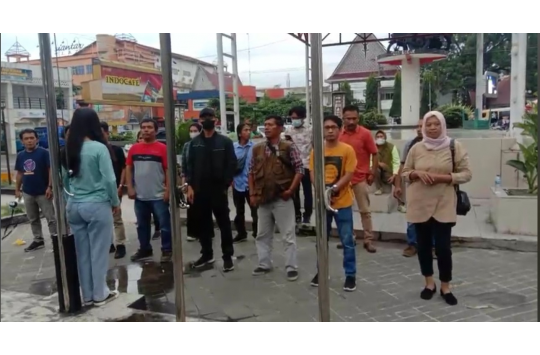Pematangsiantar - Puluhan jurnalis dari berbagai media dan mahasiswa menggelar upacara singkat di tempat Prasasti Bendera Merah Putih pertama kali di Kota Pematangsiantar, tepatnya di Lapangan Parkir Pariwisata, Jalan Merdeka, Selasa (27/9/2022).