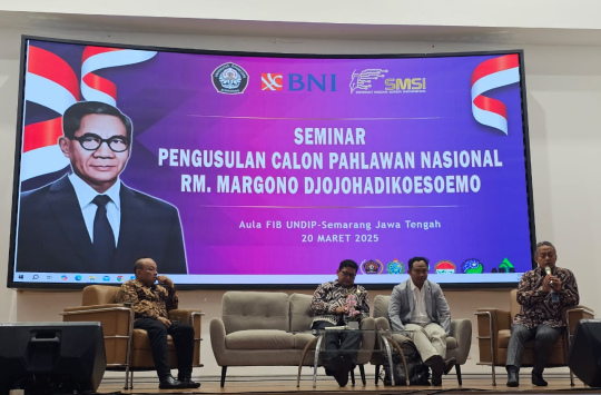 Semarang – Dalam rangka pengusulan RM Margono Djojohadikusumo Jadi Pahlawan Nasional, Serikat Media Siber Indonesia (SMSI) usai gelar Seminar Kabupaten kolaborasi dengan Seruling Mas di Purwokerto pada Selasa (18/3/2025), kembali SMSI gelar seminar di tingkat provinsi Jawa Tengah, diadakan di Art Center Fakultas Ilmu Budaya (FIB) Universitas Diponegoro (Undip) Semarang (20/3/25).
