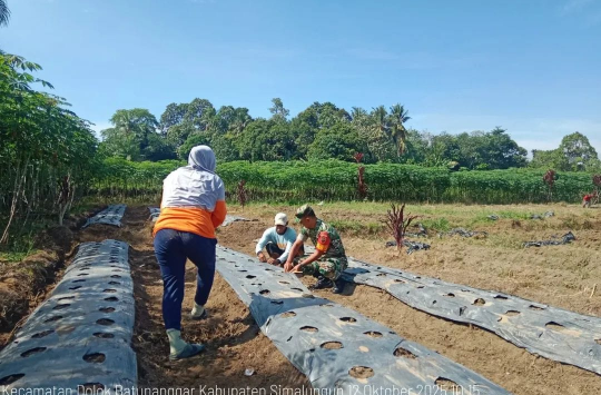 Sekitar pukul 10.15 WIB, Serda Dedy ikut serta menyiapkan lahan pertanian memasang mulsa yang akan ditanami cabai, sebagai bentuk pendampingan langsung kepada petani binaannya.