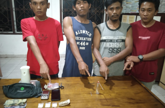 Simalungun - Empat pria yang diduga mengkonsumsi sekaligus mengedarkan narkotika jenis sabu ditangkap Sat Resnarkoba Polres Simalungun di Dusun II, Nagori Manik Raja, Kecamatan Sidamanik, Kabupaten Simalungun, Selasa, (21/2/2023) sekitar pukul 16.00 WIB.
