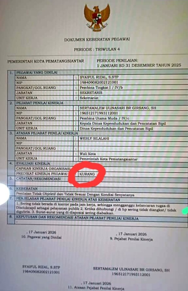 Berdasarkan dokumen Sasaran Kinerja Pegawai (SKP) saat menjabat sebagai Sekretaris Disdukcapil periode 1 Januari hingga 31 Desember 2025, saat instansi tersebut dipimpin Sertamalem Ulinasari Br Girsang, tercatat predikat kinerjanya berada pada kategori “kurang”.