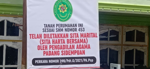 Tapsel, Kabarnas.com - Pengadilan Agama Padang Sidempuan letakkan Sita Marital (sita harta bersama) atas 13 objek sengketa harta bersama dalam perkara nomor 390/Pdt.G/2021/PA.Psp, yang dilaporkan mantan Lurah Wek II Batangtoru, Kecamatan Batangtoru, Kabupaten Tapanuli Selatan (Tapsel), Hairum Harahap.