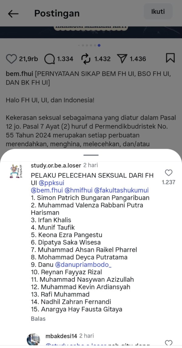 Menanggapi peryataan sikap tersebut akun @study.or.be.a.loser membeberkan 15 nama terduga pelaku pelecehan tersebut yakni;