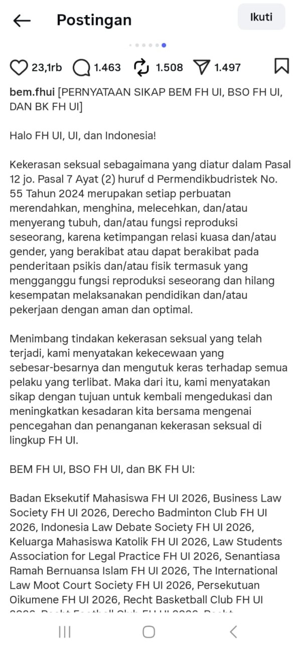 Menanggapi kasus tersebut, Badan Eksekutif Mahasiswa (BEM) dan organisasi mahasiswa lainnya di lingkungan FH UI mengeluarkan pernyataan resmi.