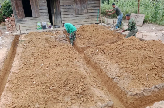 Renovasi rumah diawali dengan pembangunan pondasi sebagai struktur dasar bangunan. Tahapan ini menjadi langkah awal yang krusial dalam kegiatan pra-TMMD guna memastikan kekuatan dan ketahanan rumah yang akan dibangun agar layak dan aman untuk dihuni.