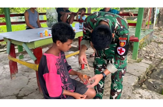 Belu, NTT – Komitmen menjaga kesehatan warga perbatasan kembali ditunjukkan personel Pos Salore Satgas Pamtas RI–RDTL Sektor Timur Yonarmed 12 Kostrad. Prajurit TNI sigap memberikan pertolongan medis kepada seorang anak yang mengalami luka sobek akibat benda tajam di Pos Salore, Desa Tulakadi, Kecamatan Tasifeto Timur, Kabupaten Belu, Nusa Tenggara Timur, Kamis (26/02/2026).