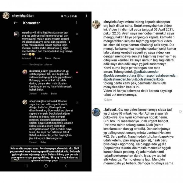 "Saya minta tolong kepada siapapun org baik diluar sana. Untuk menyebarkan video ini. Video ini diambil pada tanggal 06 April 2021, pukul 22.05. Ayah saya mencoba memukul saya menggunakan kayu panjang di kepala, kemudian mengarahkan senjata tajam yang seperti di video ke leher kiri saya namun dihalangi adik saya," demikian dikutip dari dari keterangan yang disertai video.